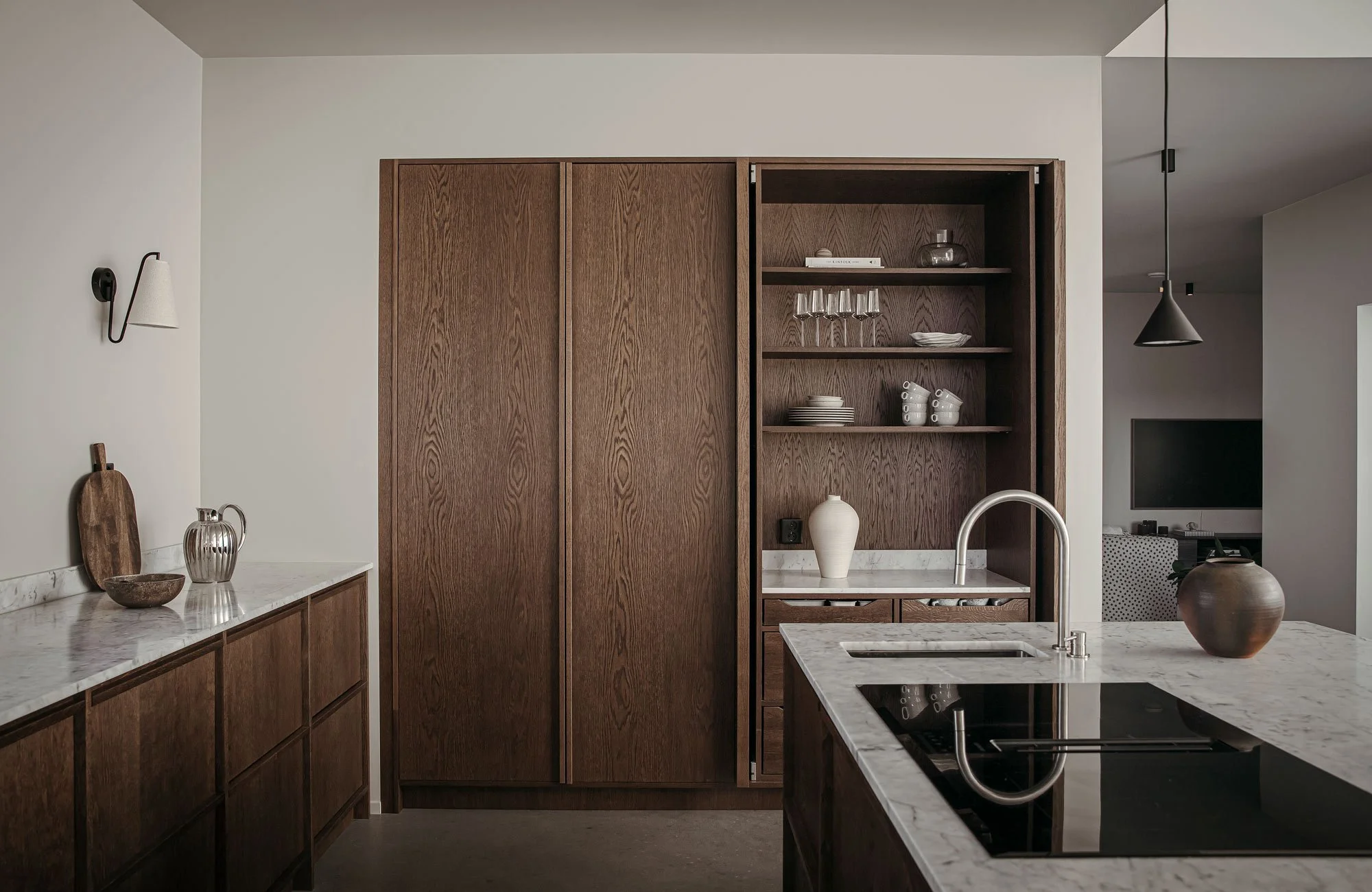 Vackra naturmaterial som mörk ek och Carrara marmor tillsammans med betonggolvet får det minimalistiska hemmet att kännas både ombonat och varmt. Kökskran från Nivito.