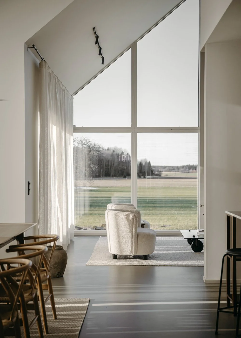 Golv i betong tillsammans med lugna, mjuka naturmaterial ger en vacker harmoni. Barstolarna är från Fritz Hansen och de pendlade lamporna från Audo Copenhagen.