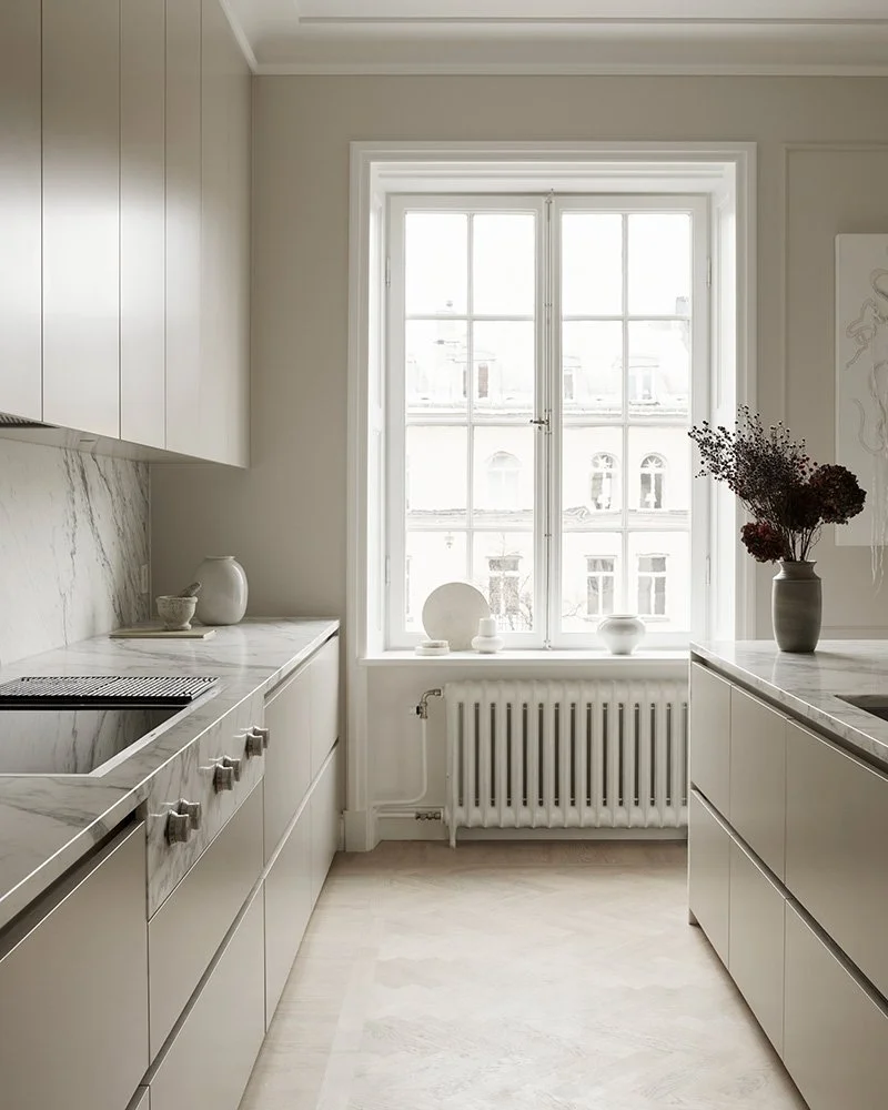 Genom att placera flera överskåp i rad skapar man en oavbruten linje som ögat kan vila på som inger lugn och harmoni. Det vackra insläppet genom fönstret skapar fina strimmor av ljus över Arabescato marmorn.