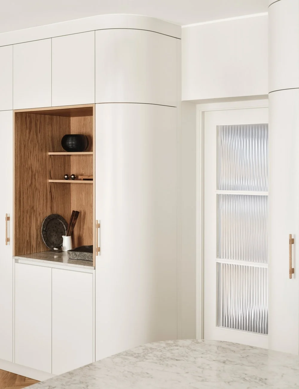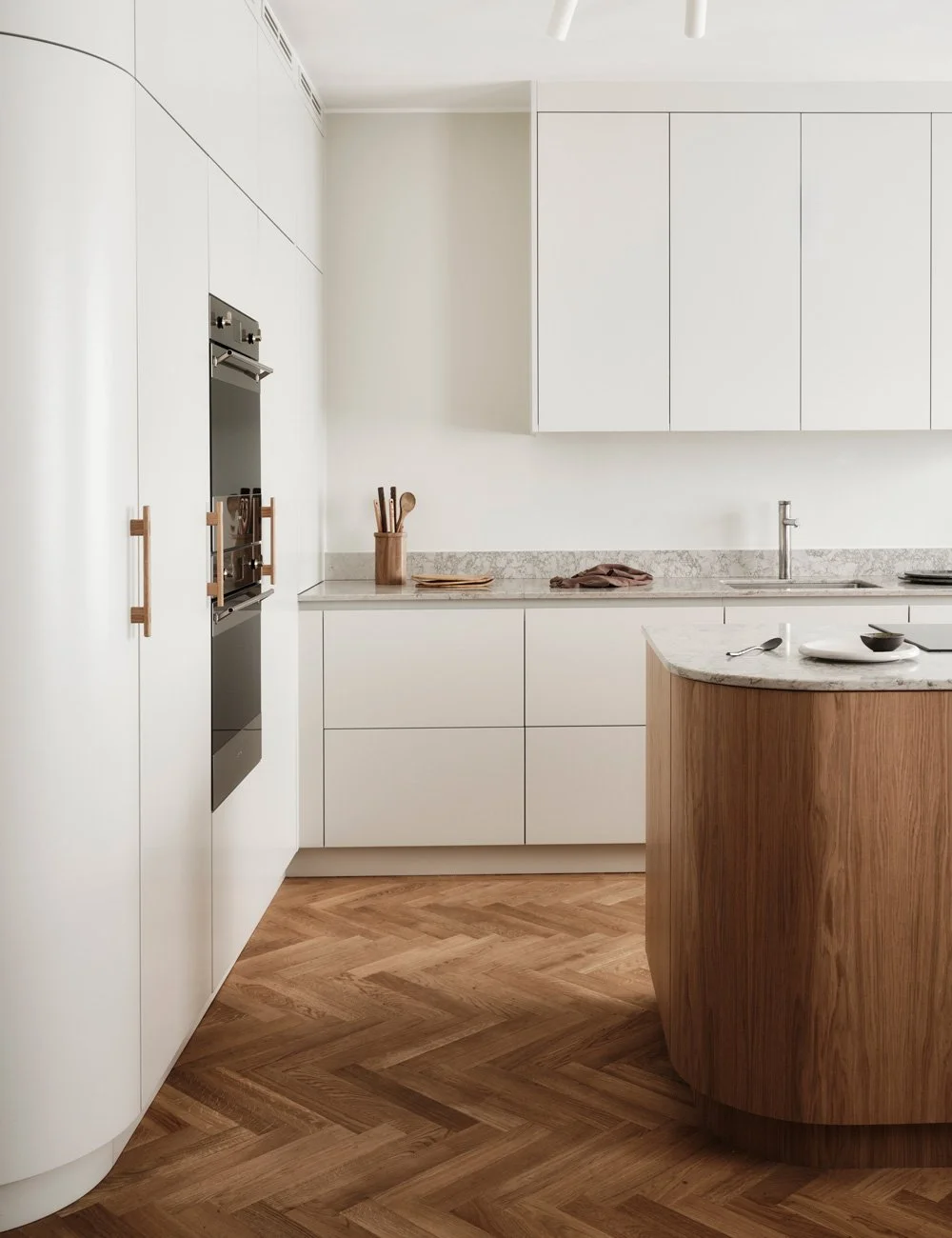“De rundade skåpen är en helt avgörande detalj för att inte känna sig trängd eller inklämd, de bjuder in och låter köket med matplats öppna upp sig.”