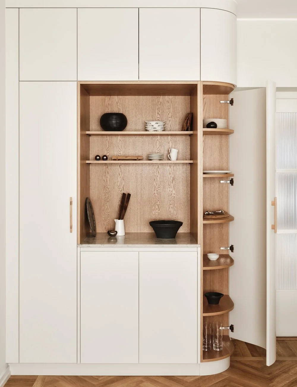 I det rundande högskåpet döljer sig förvaring, även den i vacker ek.