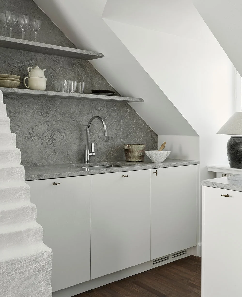Använd öppna hyllor för att både spara plats och ge ditt kök ett stilrent uttryck.