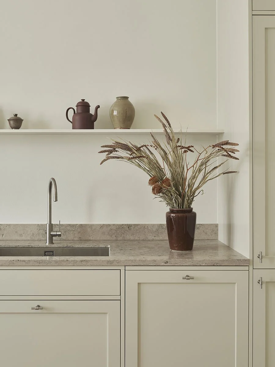 Placera en liten tavla eller keramikföremål på hyllan för att ge ditt kök ett personligt och stilrent uttryck.