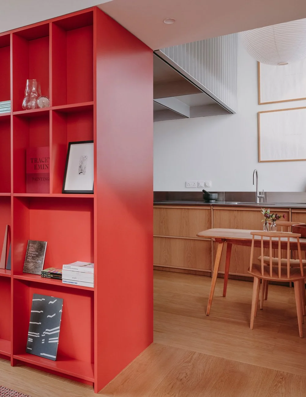 Bokhyllan, som är en del av det röda köket, fungerar som rumsavdelare mellan kök och vardagsrum, och ger samtidigt plats åt vackra stilleben och utvalda föremål.