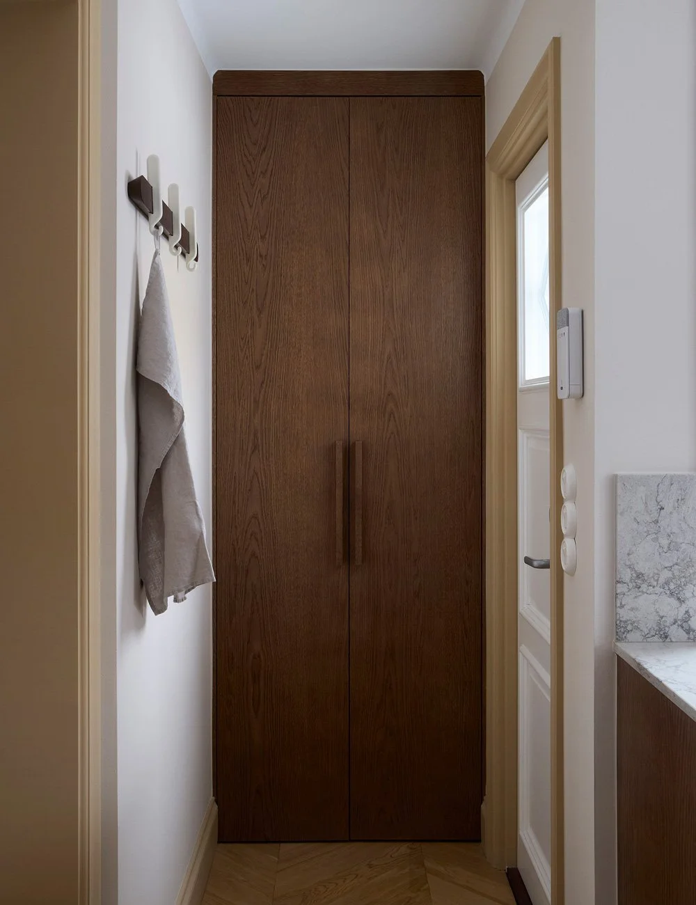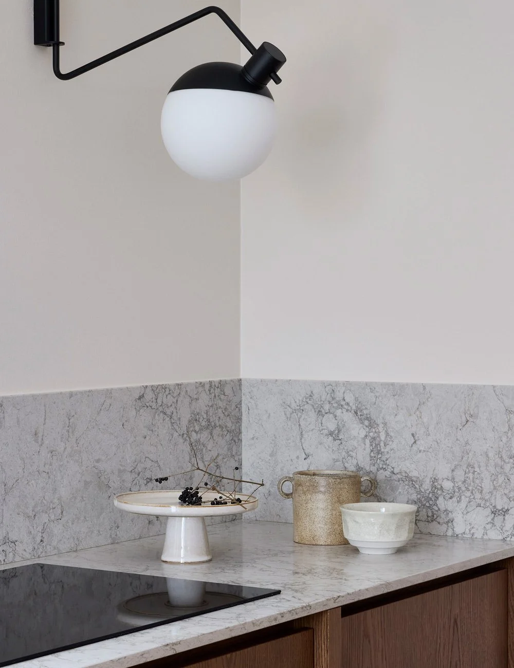 – Målet var att använda naturliga material. Vi ville ha ett kök med trädetaljer, men med starkare väggfärger för att skapa en varm och inbjudande atmosfär. Marmorväggen bakom sittbänken är ribbad, vilket ger en unik textur som var också en viktig del av vårt val, eftersom vi tycker att naturmaterial som marmor passar perfekt ihop med den övriga designen, som är relativt neutral och naturlig.