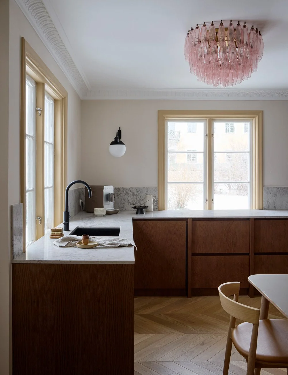 Nog utvalda kulörer och materialval skapar en personlig och elegant atmosfär i köket. Den vackra taklampan i rosa Murano-glas kommer från Cherry Vintage.