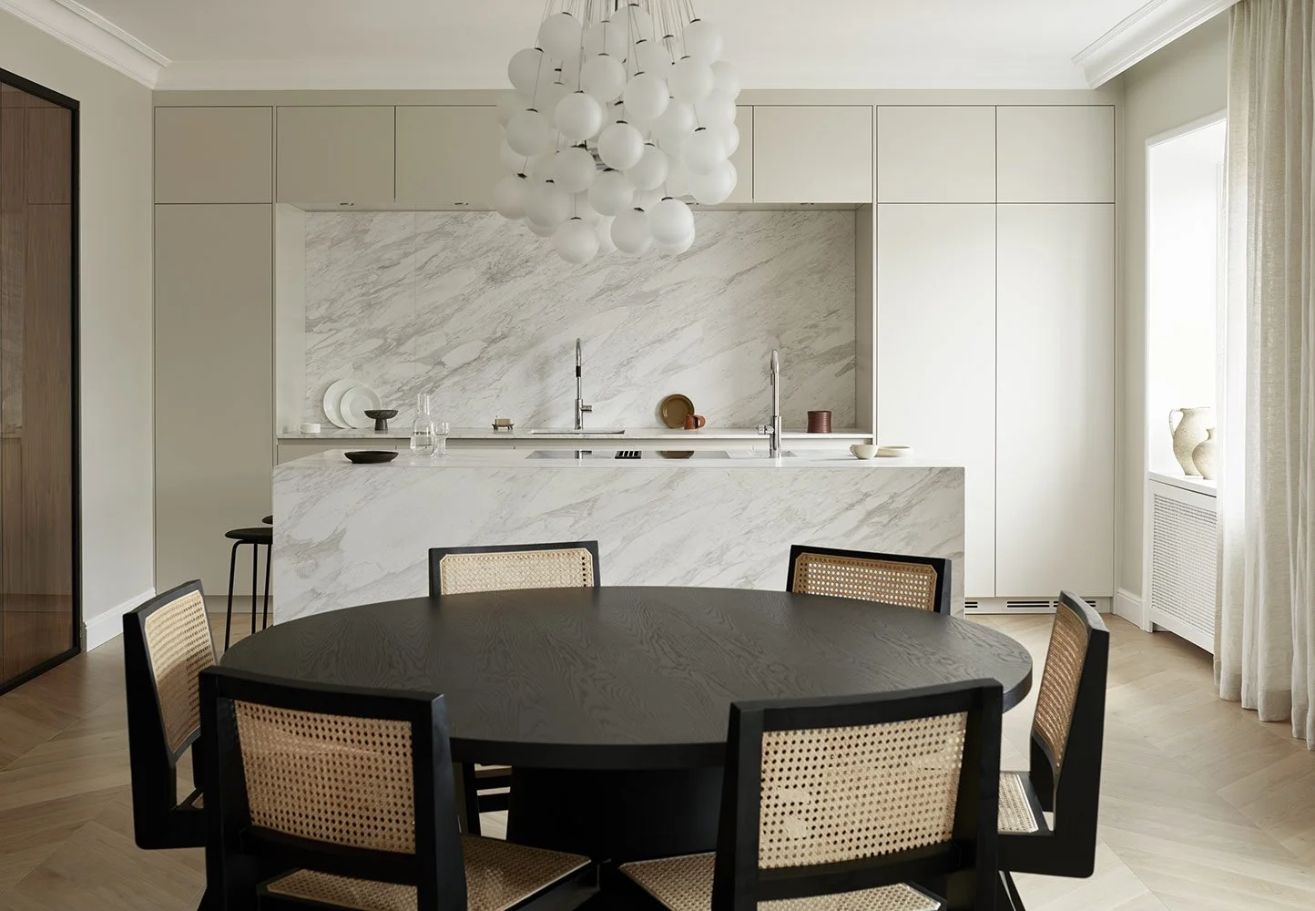 Det funktionella köket smälter på ett diskret och elegant sätt in i resten av rummet tack vare att man skalat av så mycket det går och valt en harmonisk kulör samt en lugn marmor.