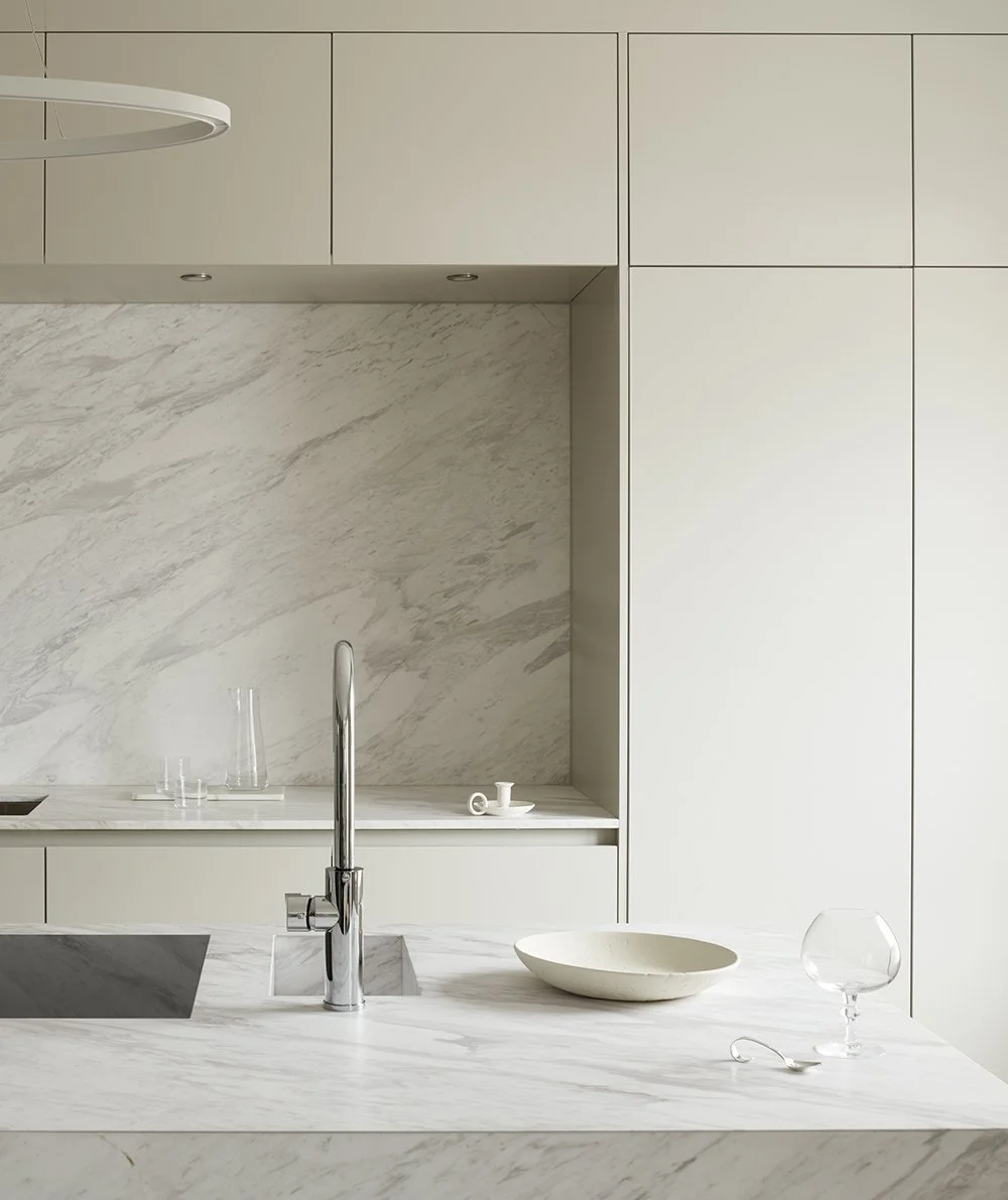 För att matcha de släta luckorna i beigegrått har man valt en Estremoz marmor. Stenen klär förutom bänkskivan även hela väggen bakom diskbänken samt den stora köksön. De breda skivorna marmor gör att köket känns elegant och påkostat och marmorns mönster ger rummet ett harmoniskt lugn.