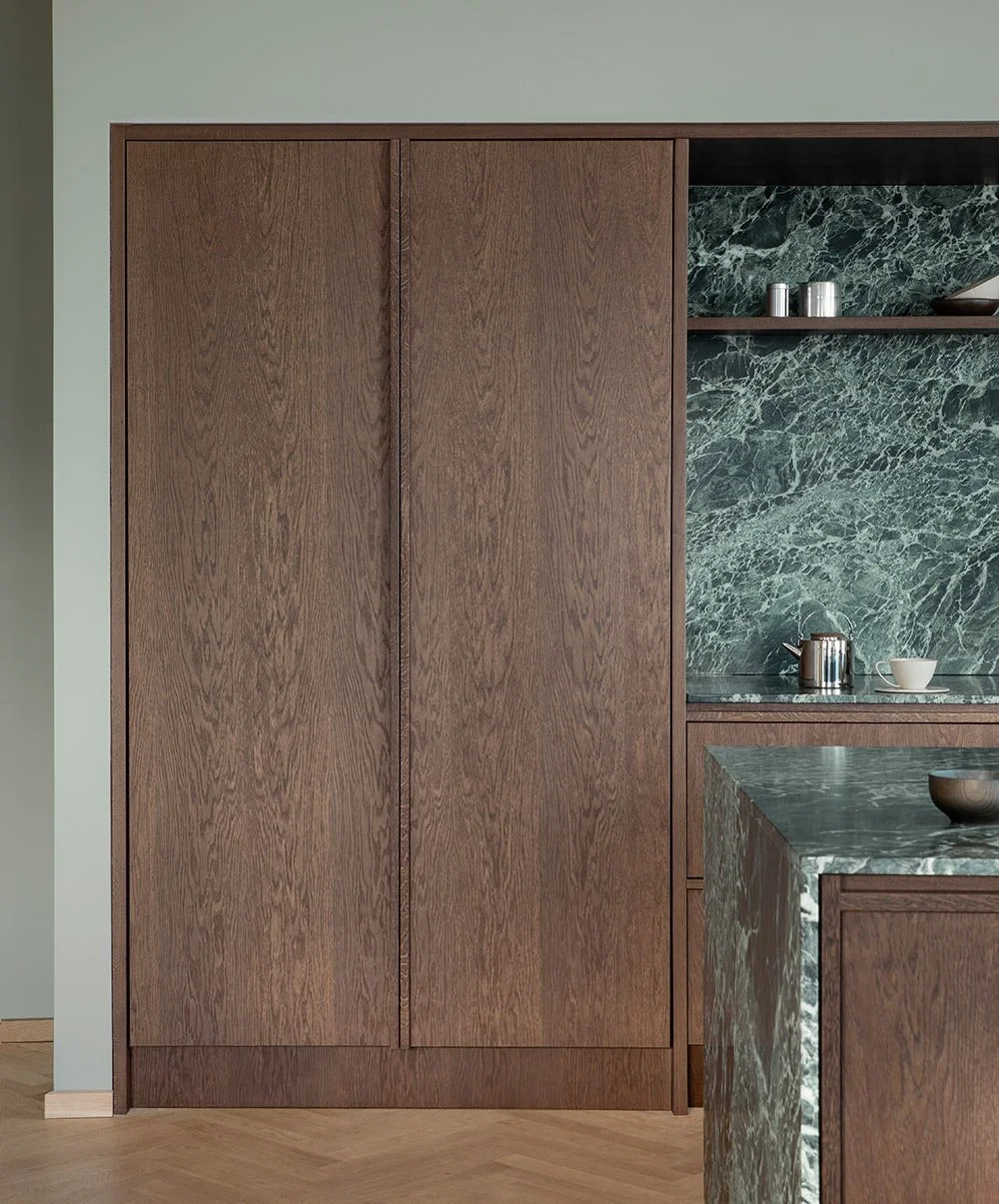 Köket är måttanpassat in i minsta detalj för att passa perfekt i rummet – med underskåp och överskåp som integrerats i väggen. Luckorna i mörk ek med sin vackra ådring ger en taktil, naturnära känsla och skapar en varm kontrast till den djupt gröna Verde Alpi-marmorn. Marmorns levande mönster är en subtil blinkning till havets rörelse och djup – en påminnelse om platsens närhet till kusten.