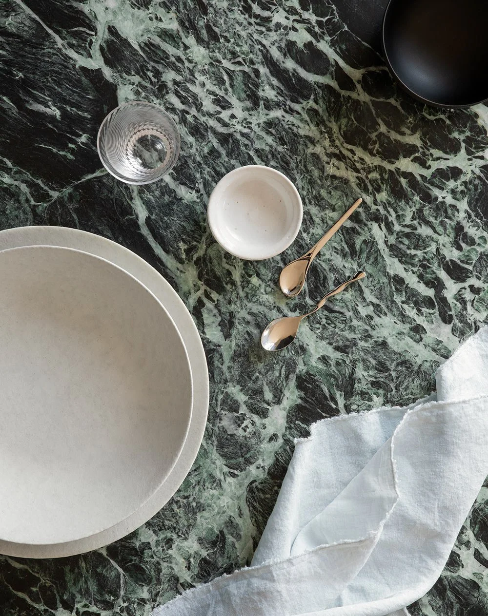 Till bänkskiva valdes stenen Verde Alpi – en mörkt grön italiensk marmor med dramatiska skiftningar och tydliga ådringar i toner av vitt och svart. Läs vår guide om hur du väljer rätt bänkskiva till köket.