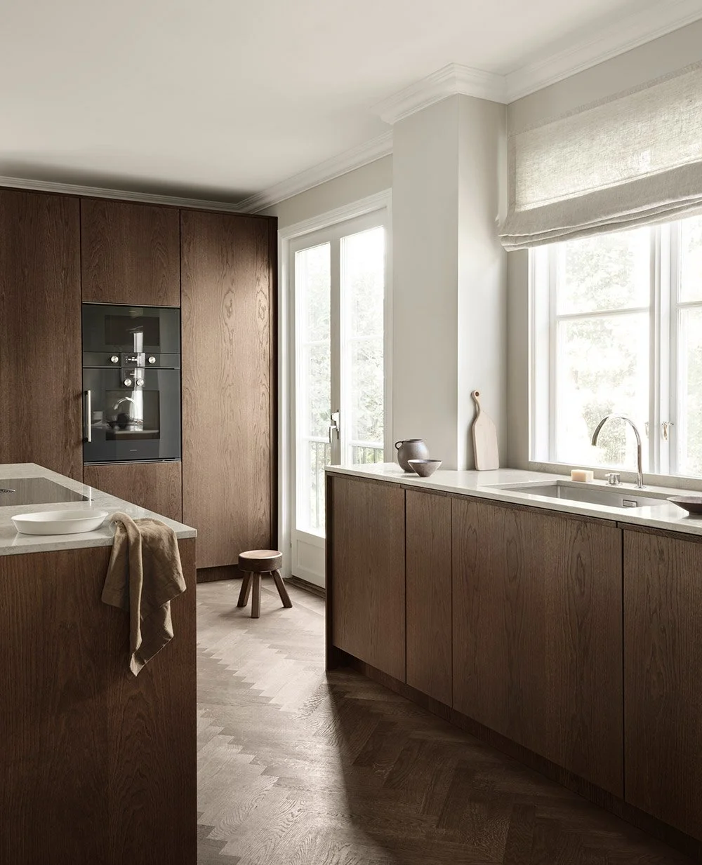 Fiskbensparketten matchas i nyans med kökets mörkbruna bets.