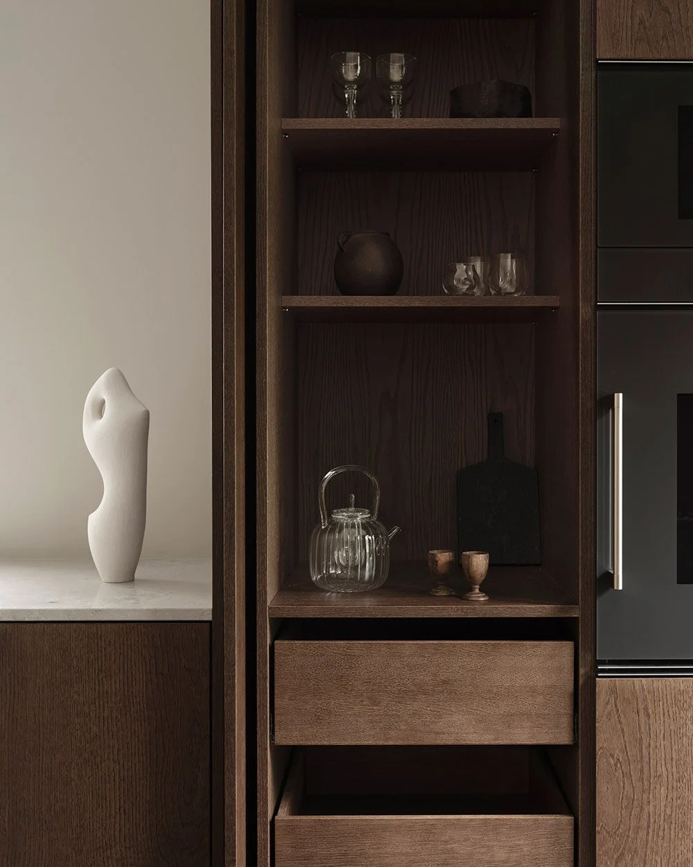 Längs med ena kortsidan är ugn och mikro integrerade i högskåp, på praktisk arbetshöjd. De intilliggande skåpen har pocket doors vilka döljer skåpets innehåll snabbt och smidigt. Det skapar inte bara en lugnare atmosfär utan håller även gången fri hela vägen fram till terrassdörren.