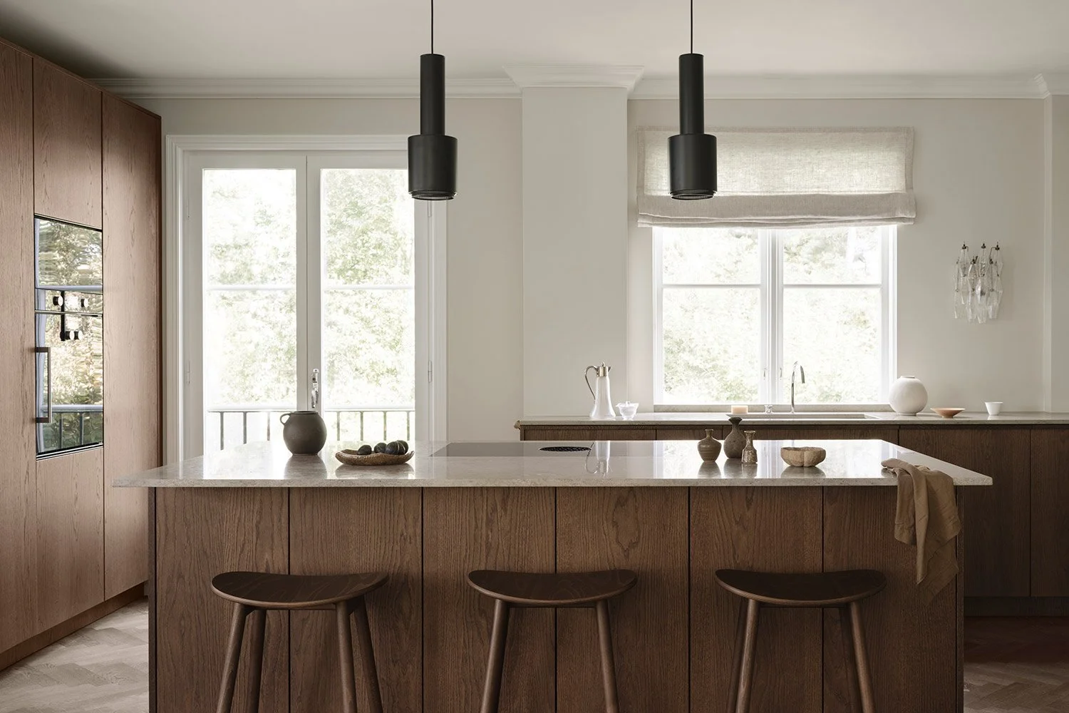 I villaidyllen i Bromma i Stockholm har en klassiskt vacker funkisvilla återfått sin forna glans genom noggrann renovering. Mitt i hemmet har vi skapat ett stilrent träkök med skåpsluckor i varm mörkbetsad ek, behagligt omfamnat av den grå Jura-kalkstenen.