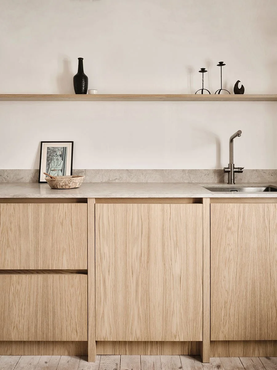 Ett ljust träkök i dansk design hemma hos den danska inredaren Allan Torp. Släta luckor och lådor, dold grepplist och rustikt ramverk matchas med bänkskiva i kalksten.