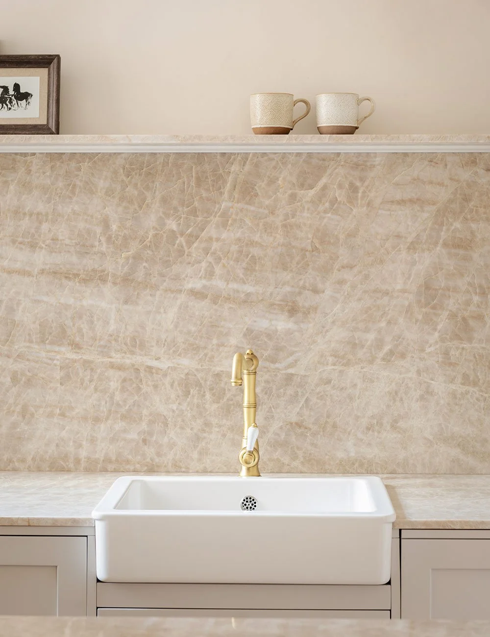 Den vackra porslinshon tillför en klassisk känsla till köket tillsammans med blandaren i mässing.