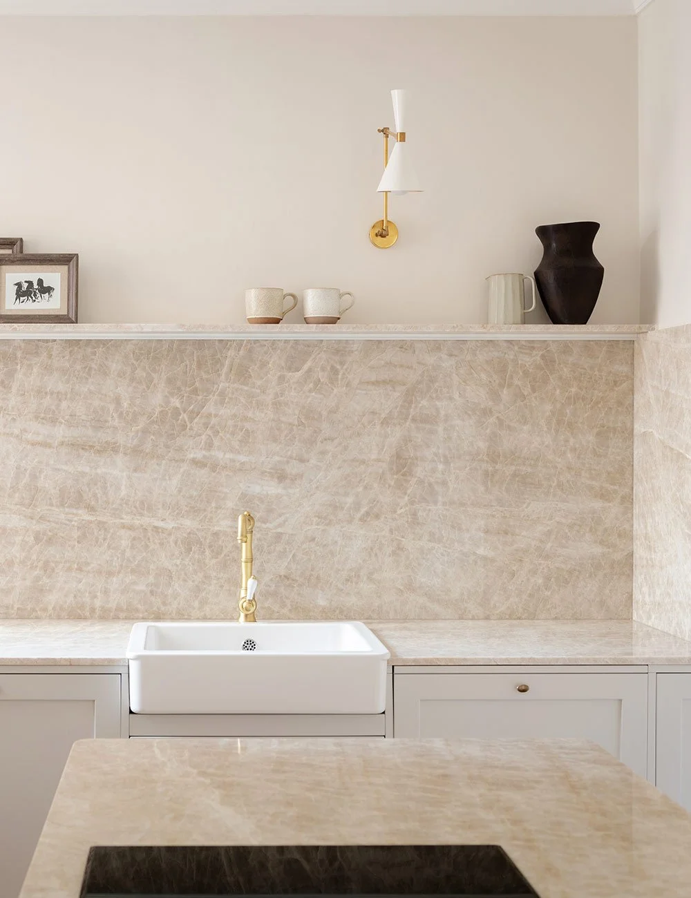 De ljusa tonerna och bänkskivan i Taj Mahal kvartsit ger en elegant känsla i köket.