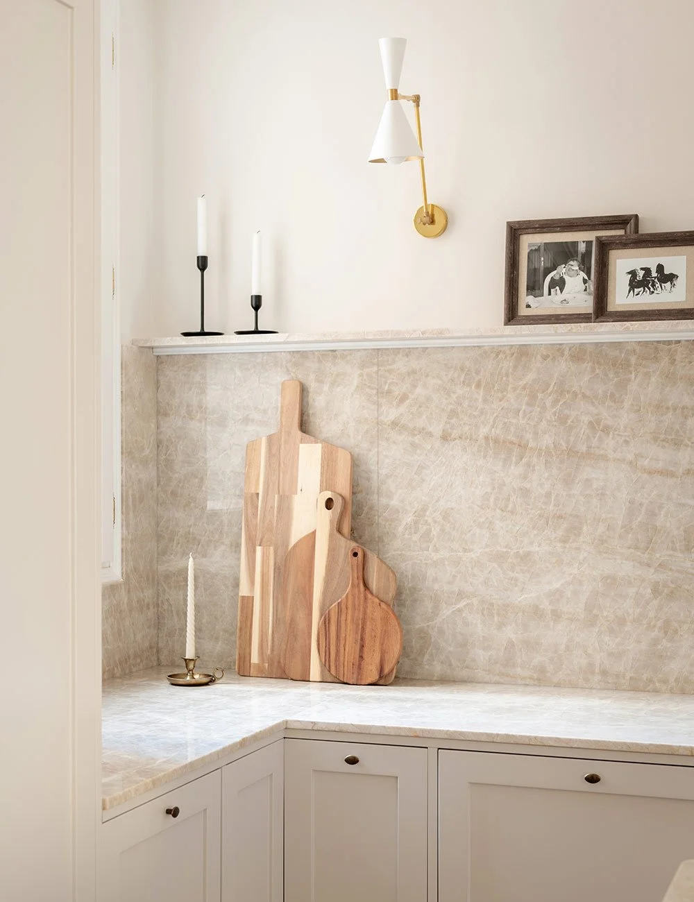 Taj Mahal kvartsiten återfinns en bit upp på väggen och avslutas med en grund hylla där Emelie placerat vackra föremål.