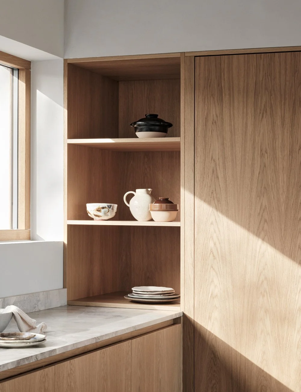 Ljust träkök med marmor och naturliga material, där rena linjer skapar en perfekt balans mellan rustik charm och skandinavisk design.