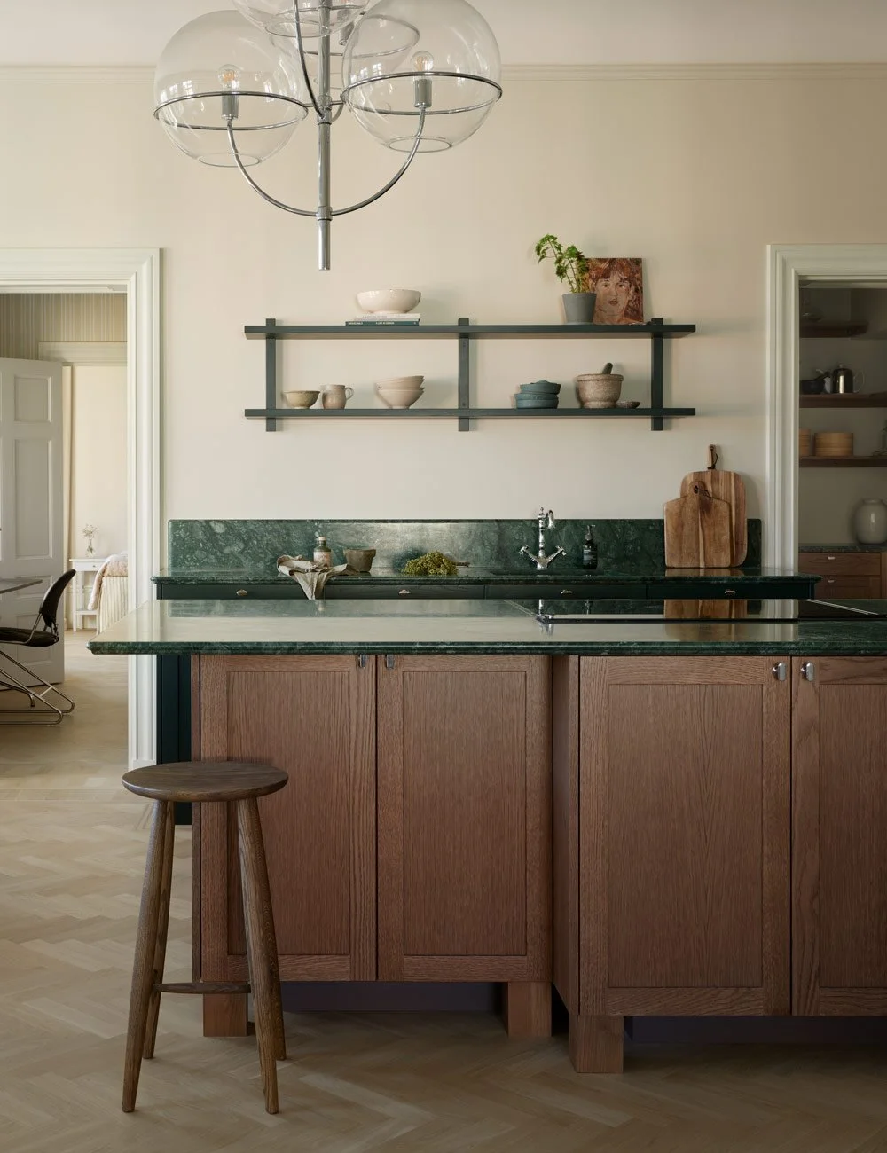 Köksön står på klossformade ben i samma nyans som snickerierna, vilket skapar en rustik kontrast till det eleganta gröna. Häll och ugn från SMEG.