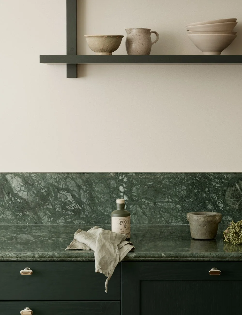 På väggen ovanför sitter en öppen hylla, målad i samma kulör som köket.