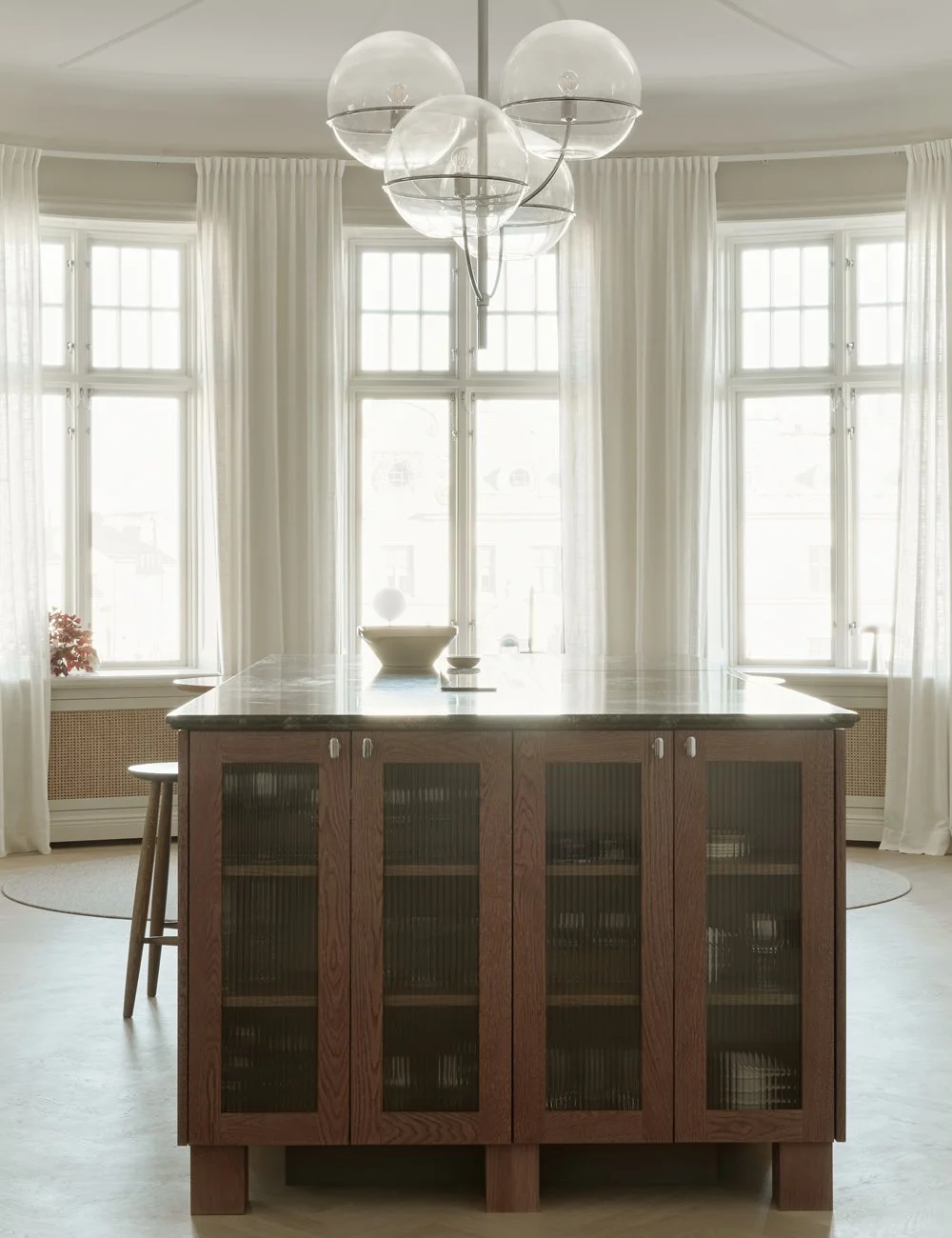 Köksön i mörk ek har vitrinskåp med linjeglas.