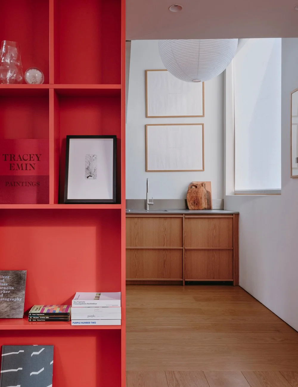 Den röda bokhyllan ger en livfull kontrast till köket i trä och skapar ett personlig och inbjudande hem. Se mer från arkitektens röda kök i Grand Designs.