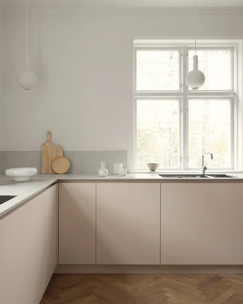 Välj mjukare nyanser som ljusrosa om du vill ha färg i köket, men ändå behålla en lugn och harmonisk atmosfär.