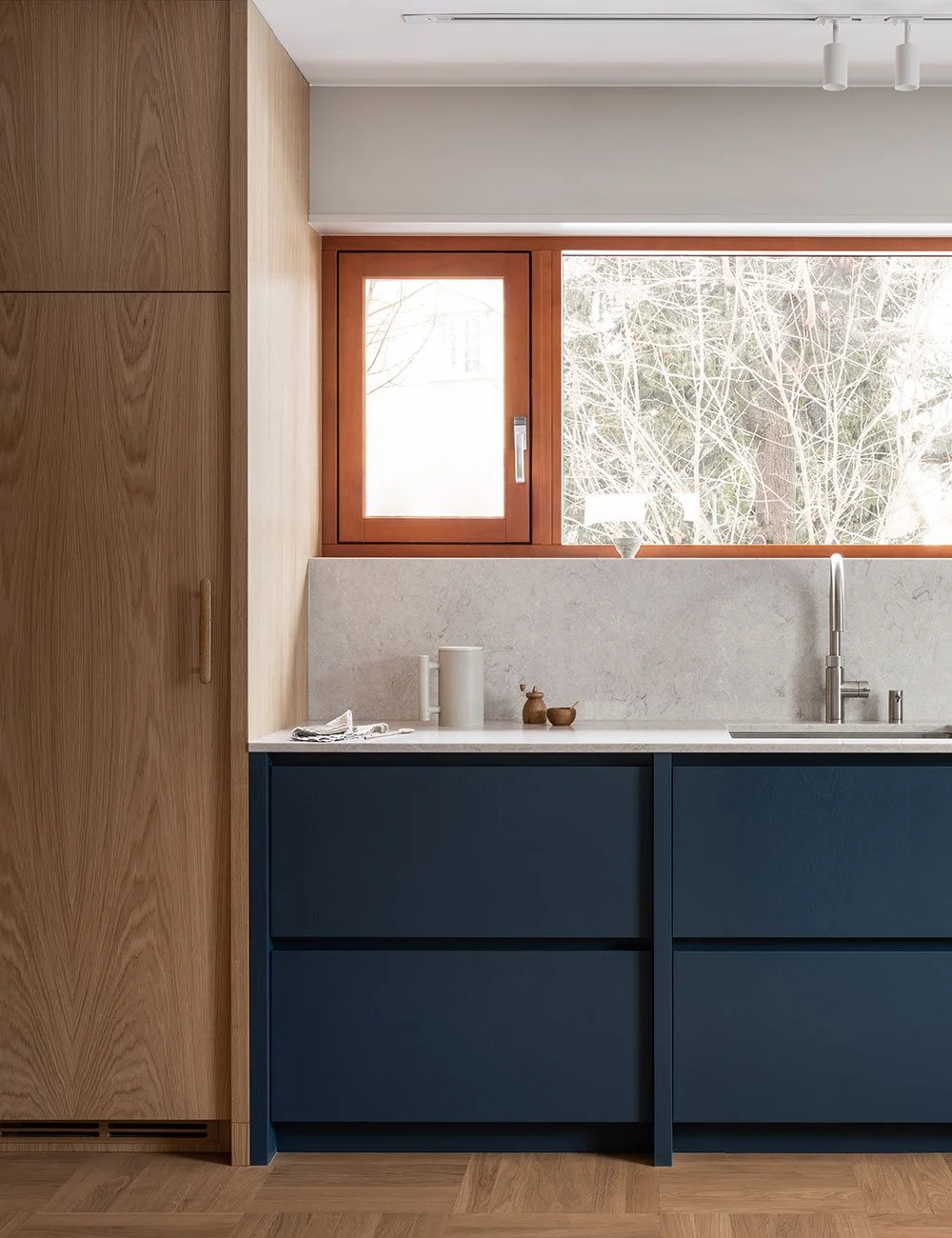 Ett träkök passar bra med många olika bänkskivor – från terrazzo och natursten till komposit och rostfritt. Marmor och kalksten ger en organisk, harmonisk känsla och skapar ett tidlöst, exklusivt uttryck. Stenens färg kan matchas med träets nyans eller med omgivande interiör för att skapa en enhetlig och genomtänkt design.