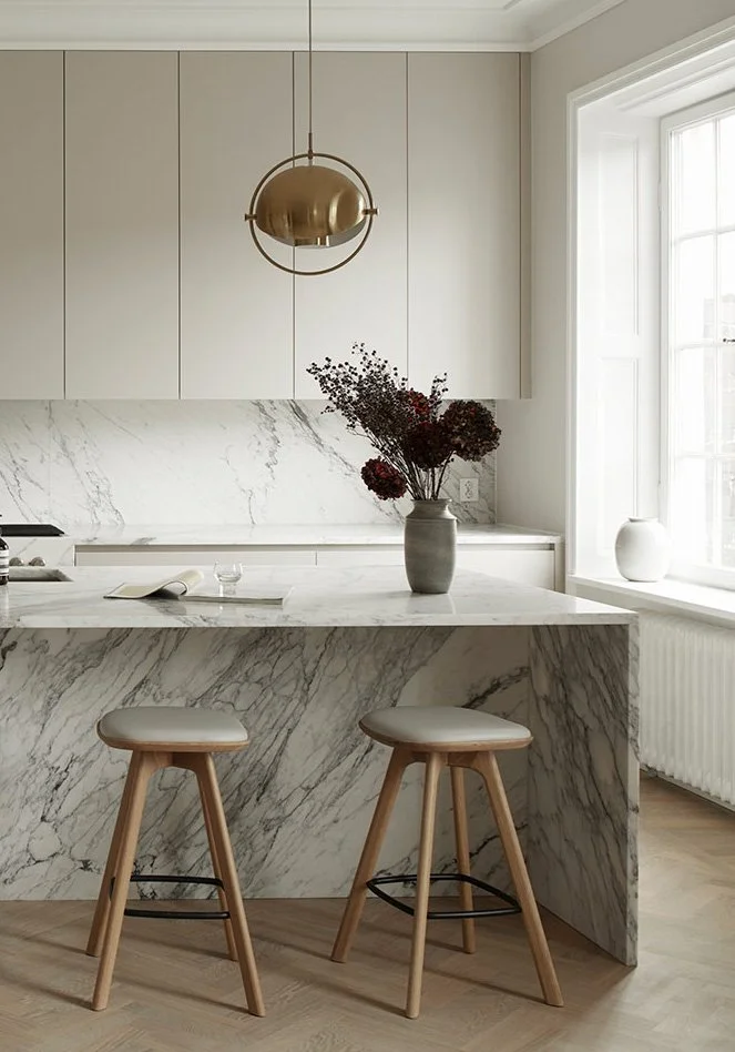 Bänkskivan spelar en nyckelroll i det minimalistiska köket – både visuellt och praktiskt. Den ska smälta in i helheten med rena linjer och dämpade färger, samtidigt som den tål vardagens användning. Natursten, komposit och betong är populära val som ger ett sobert uttryck och bidrar till den avskalade känslan. En slät, odekorerad yta utan synliga skarvar förstärker det stilrena intrycket och låter materialen tala för sig själva.