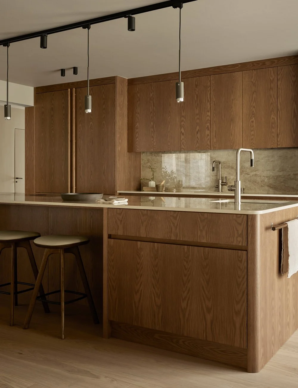 Kliv in i arkitektens ljusa Japandi-kök i Köpenhamn. Ett minimalistiskt kök i ljus ek där naturlig värme möter arkitektonisk precision och skapar ett balanserat, harmoniskt uttryck.