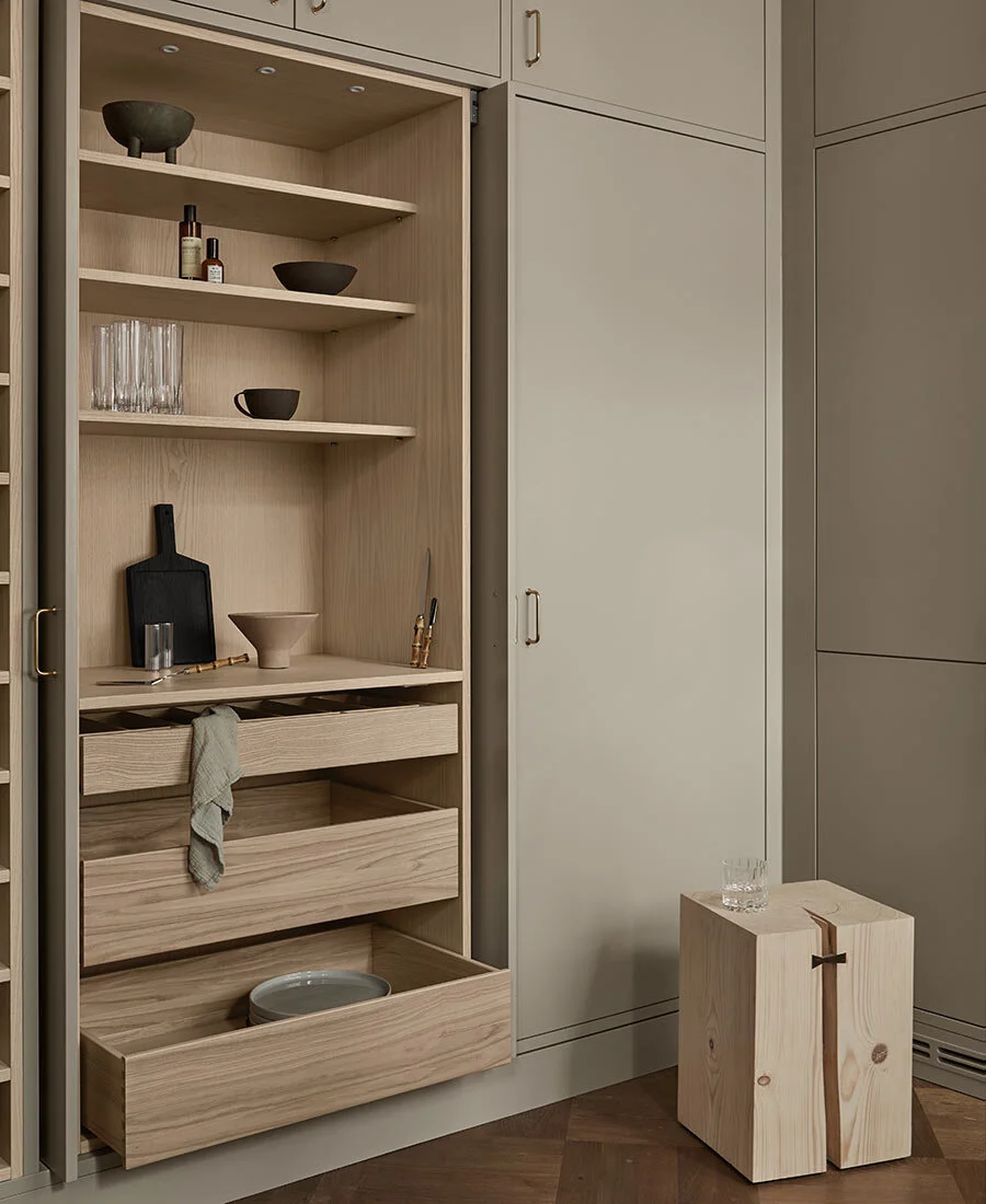 Pocket door-skåp i ask med massiva trälådor och mycket förvaring.