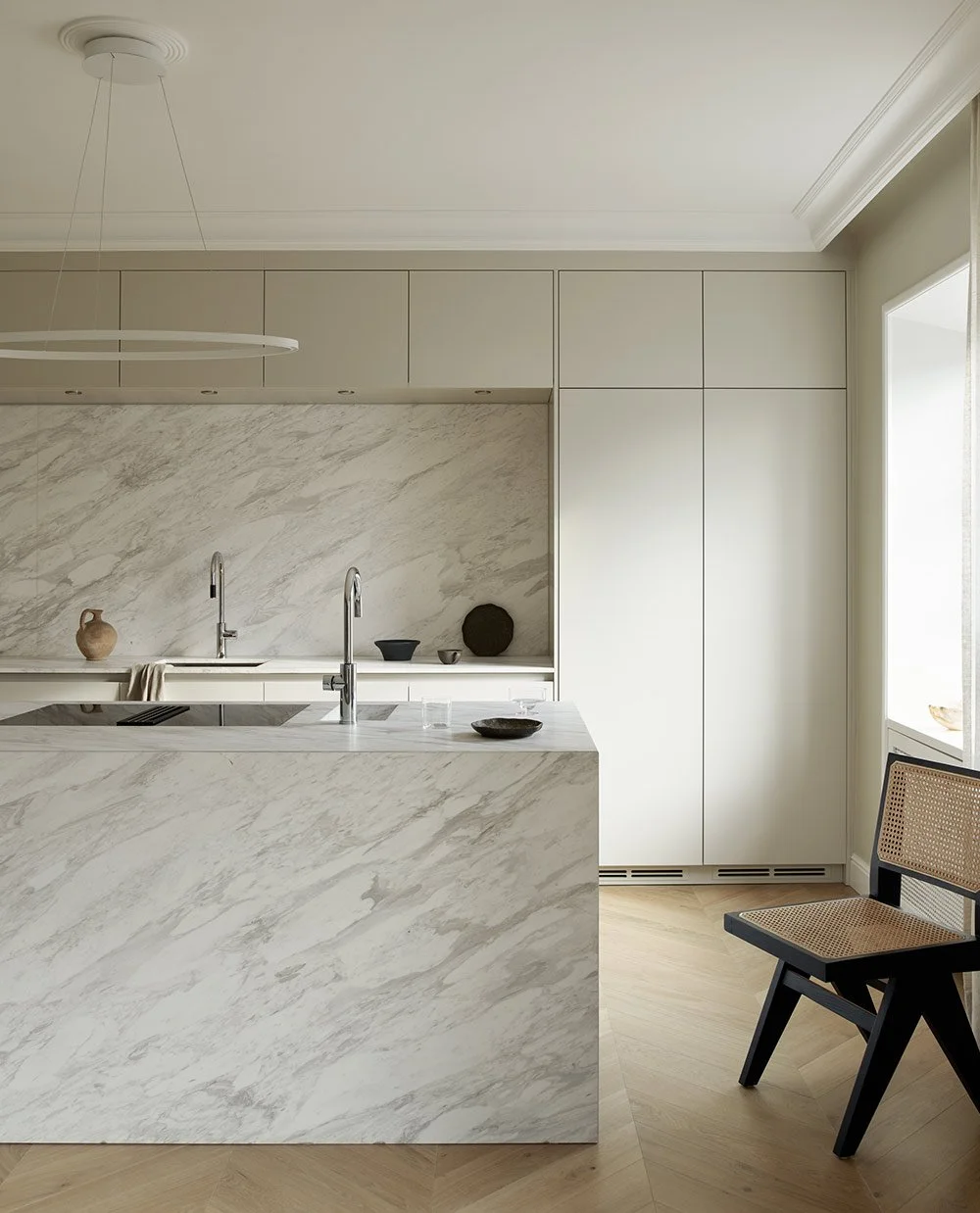 Höga väggskåp skapar en luftig känsla tillsammans med den vackra köksön i marmor. Fint ackompanjerat av den snygga stolen från Cassina.