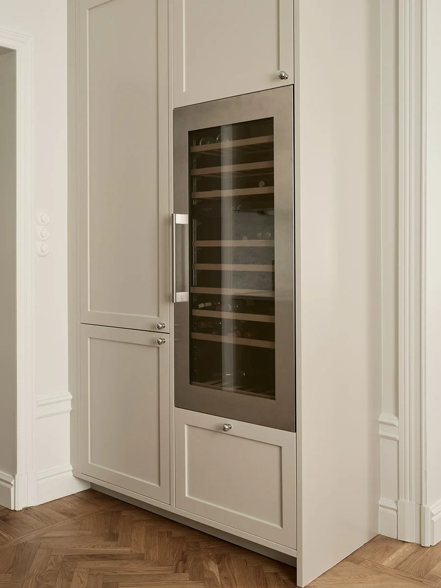Inbyggda vitvaror skapar ett harmoniskt lugn och de vackra vitrinskåpen med ljusa ekinsidor blir som kökets vackra smycke. Köksblandare från Tapwell och ho från Decosteel.