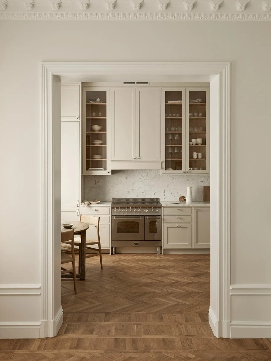 Köket är en mix av rustik charm och modern elegans och passar perfekt in i den vackra sekelskiftesvåningen.