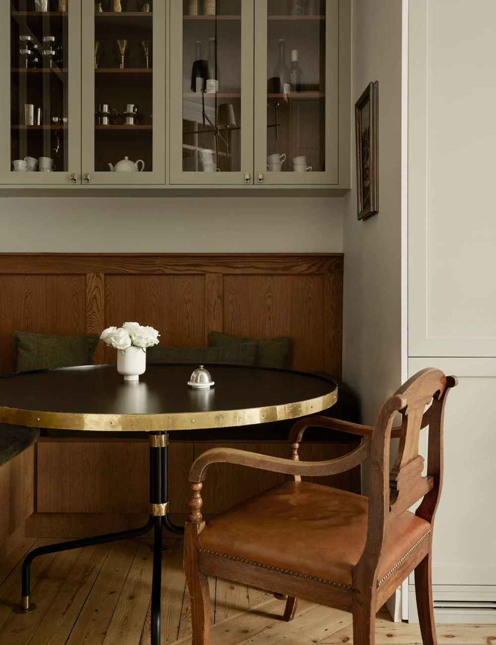 Den platsbyggda kökssoffan och vitrinskåpen som sträcker sig hela vägen upp till taket gör bistrodelen till en charmig och inbjudande del av köket.