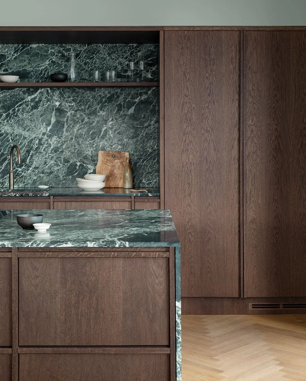 Vackert träkök i den arkitektritade villan vid kusten utanför Köpenhamn. Mörk ek tillsammans med grön marmor och smarta pocket door-skåp.