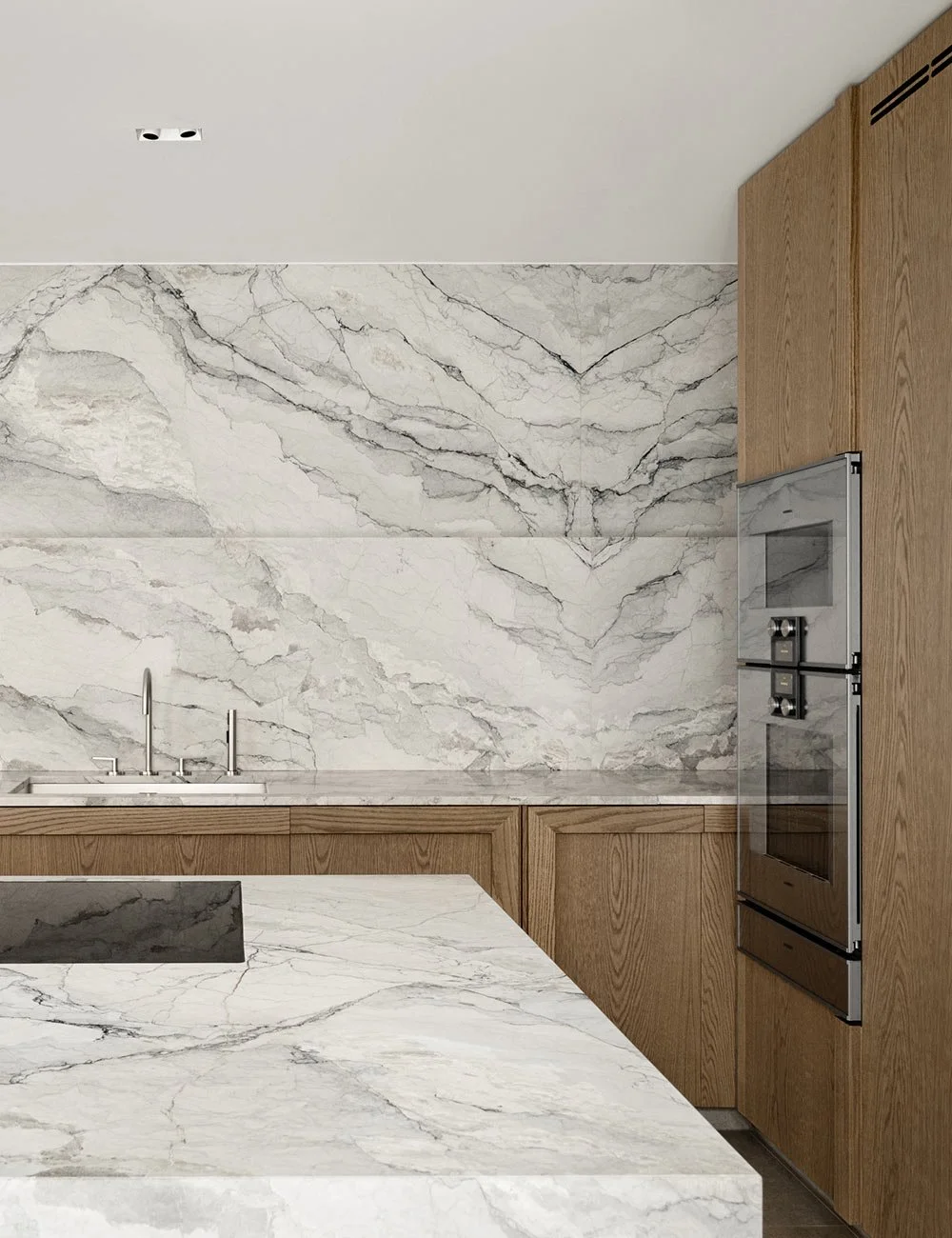 Exklusiv köksö i White camouflage-marmor med insida i trä.