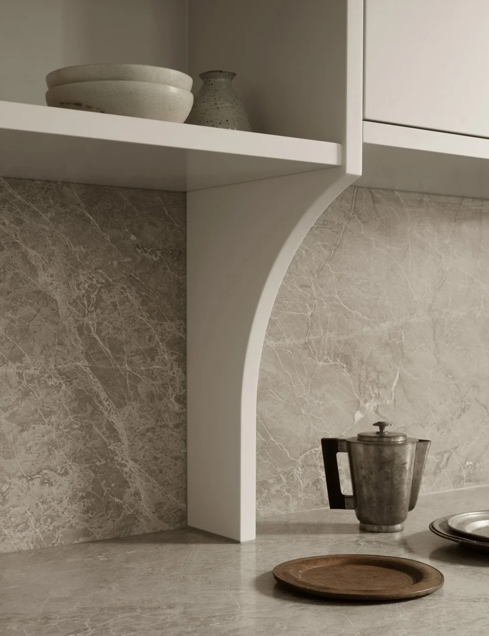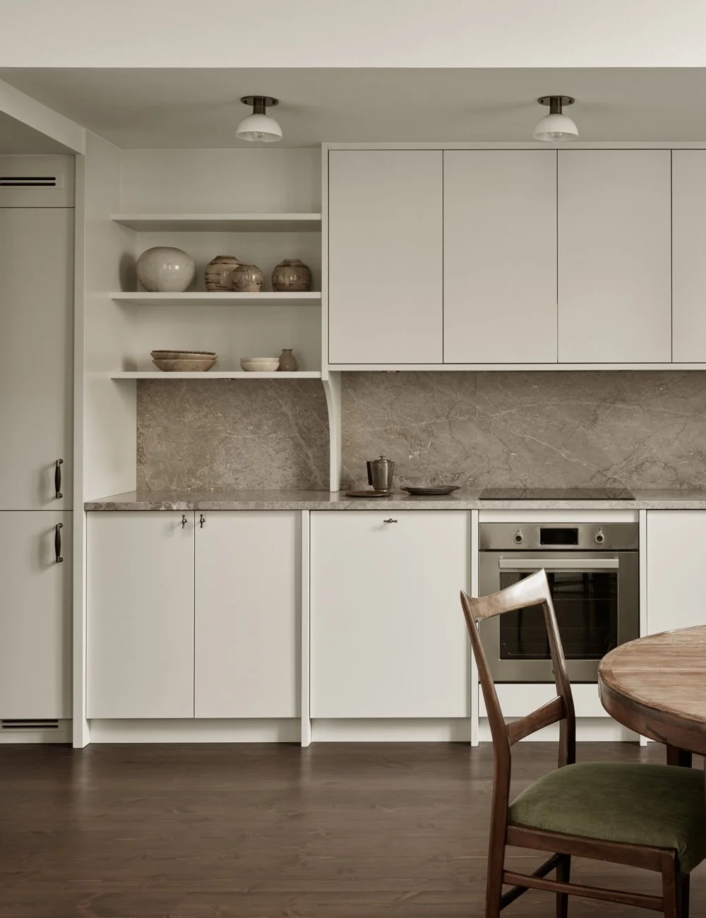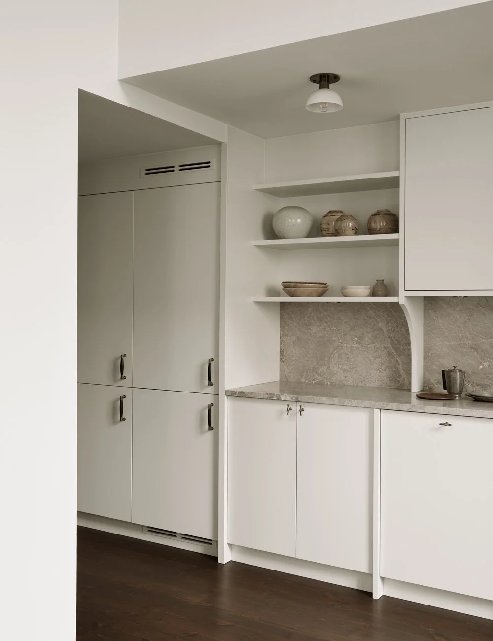 De öppna hyllorna ger utrymme för vacker keramik att ta plats.